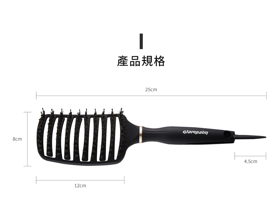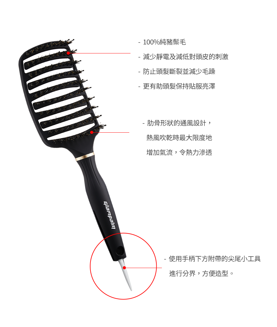 - 100%純猪鬃毛、能滋養髮絲,抗毛躁、抗靜電、使髮絲更光澤柔順,不易打結。用後有助頭髮保持貼服亮澤及減低對頭皮的刺激防止頭髮斷裂。