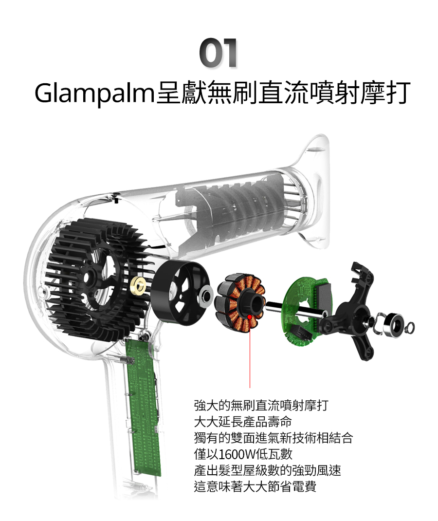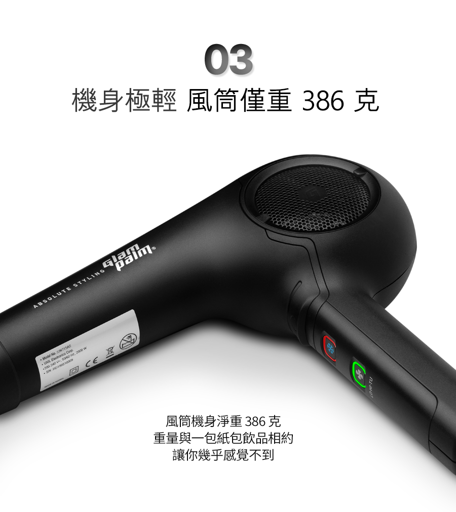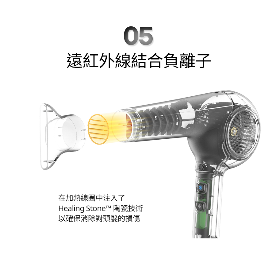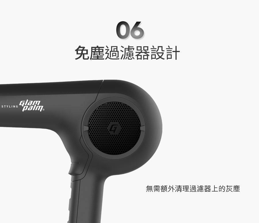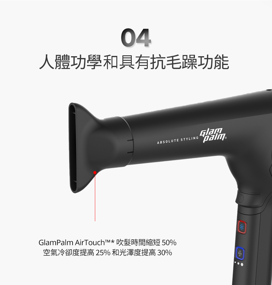將 Glampalm 的 Healing Stone™️ 技術注入遠紅外線並結合負離子的產生,吹髮時間縮短 50%、空氣冷卻度提高 25% 和光澤度提高 30%*。