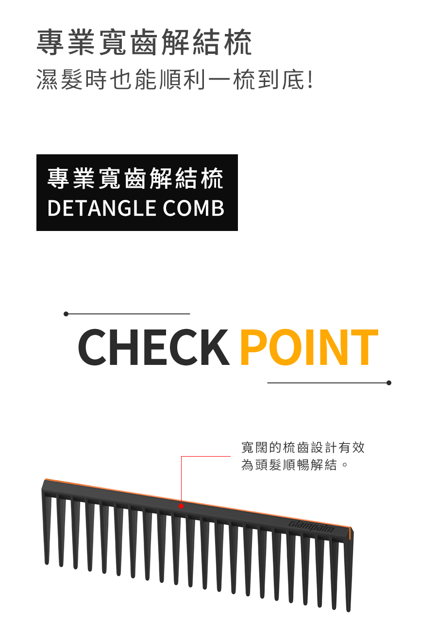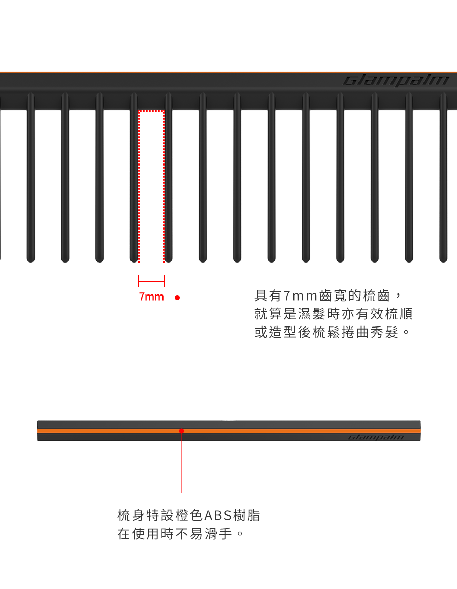 - 梳身特設橙色ABS樹脂在使用時不易滑手